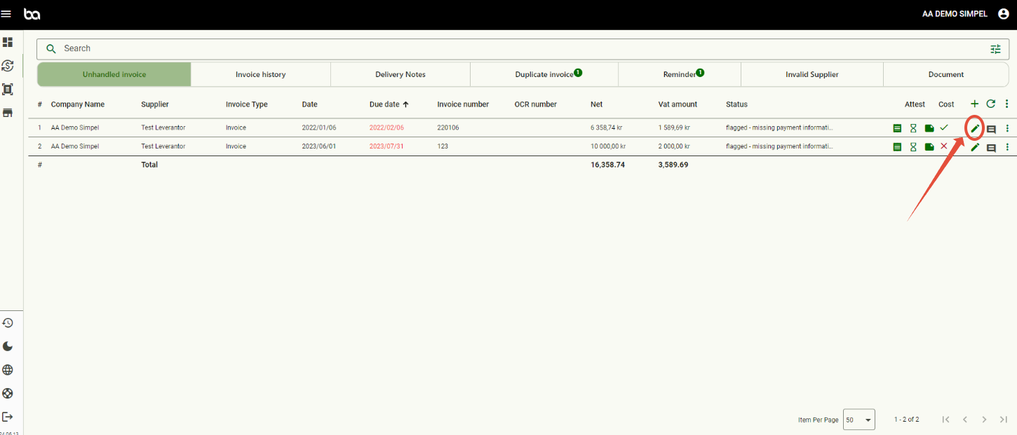 Step 1, Go to Economy>Invoice management and then press the pen of the invoice you want to do period allocation for