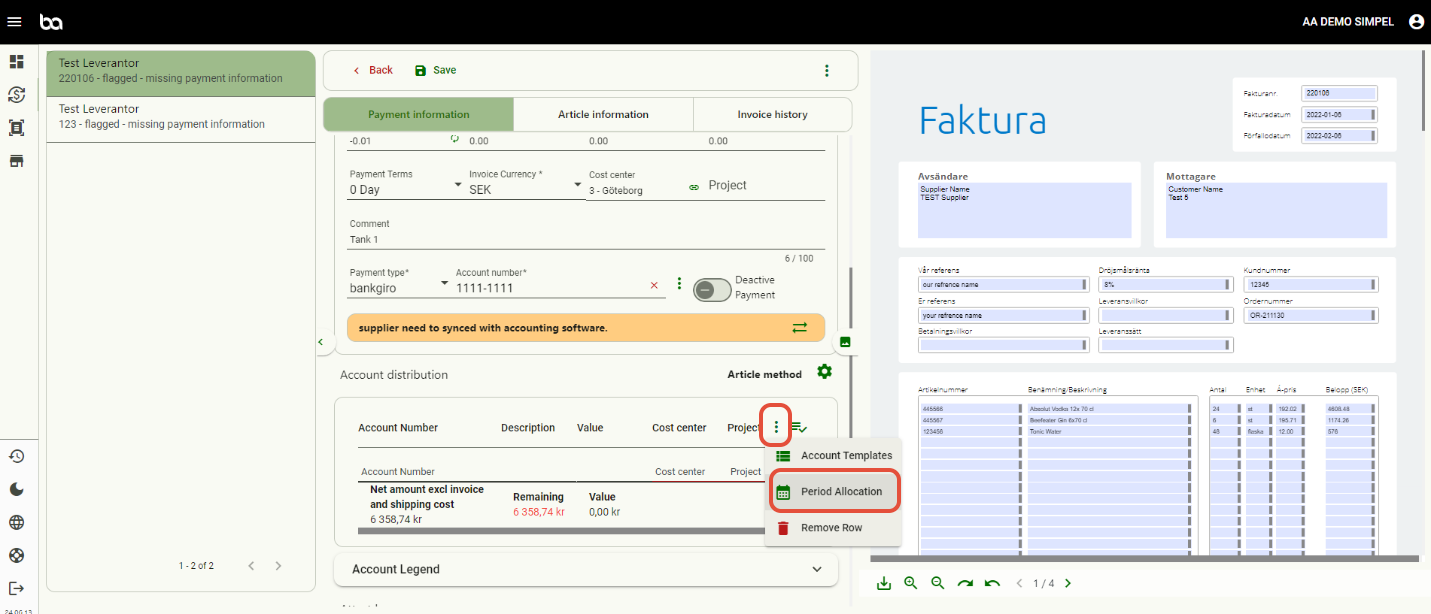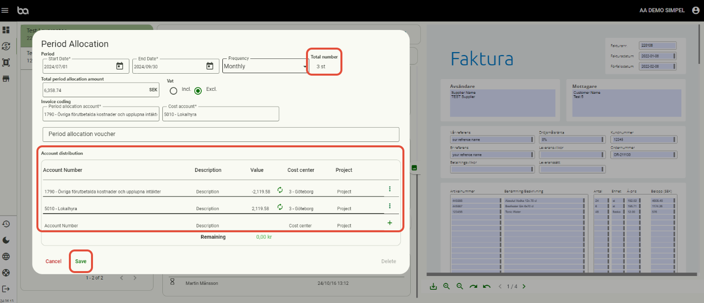 Below is an example or a rent invoice that is period allocated over three months. Furthermore you can also choose cost centers and/or projects.