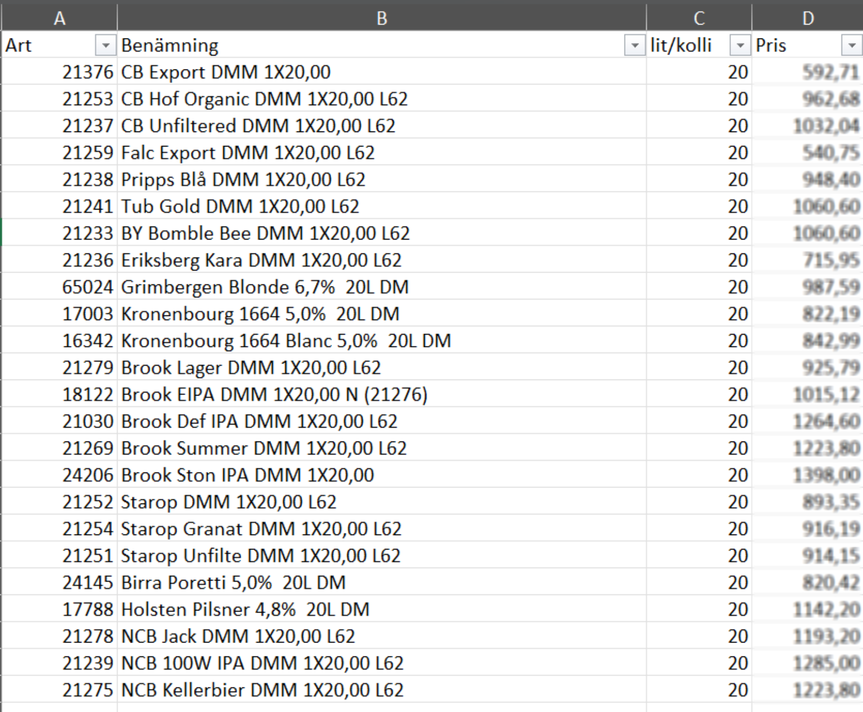 This is an example of a price-/ anbudslist list from Carlsberg. You need to ensure that the following information is included:
