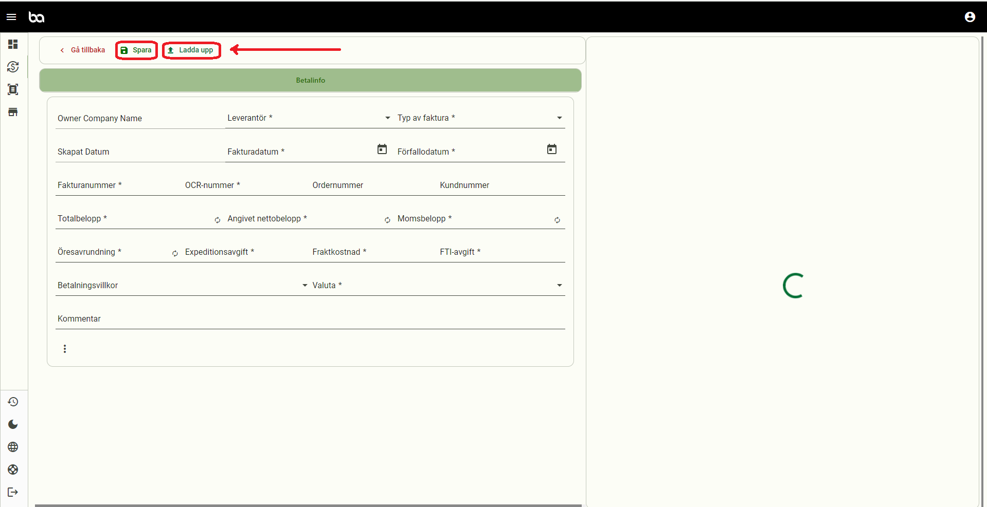 Ladda först upp dokumentet och fyll sedan i de obligatoriska fälten. Klicka på "Spara" för att ladda upp fakturan.