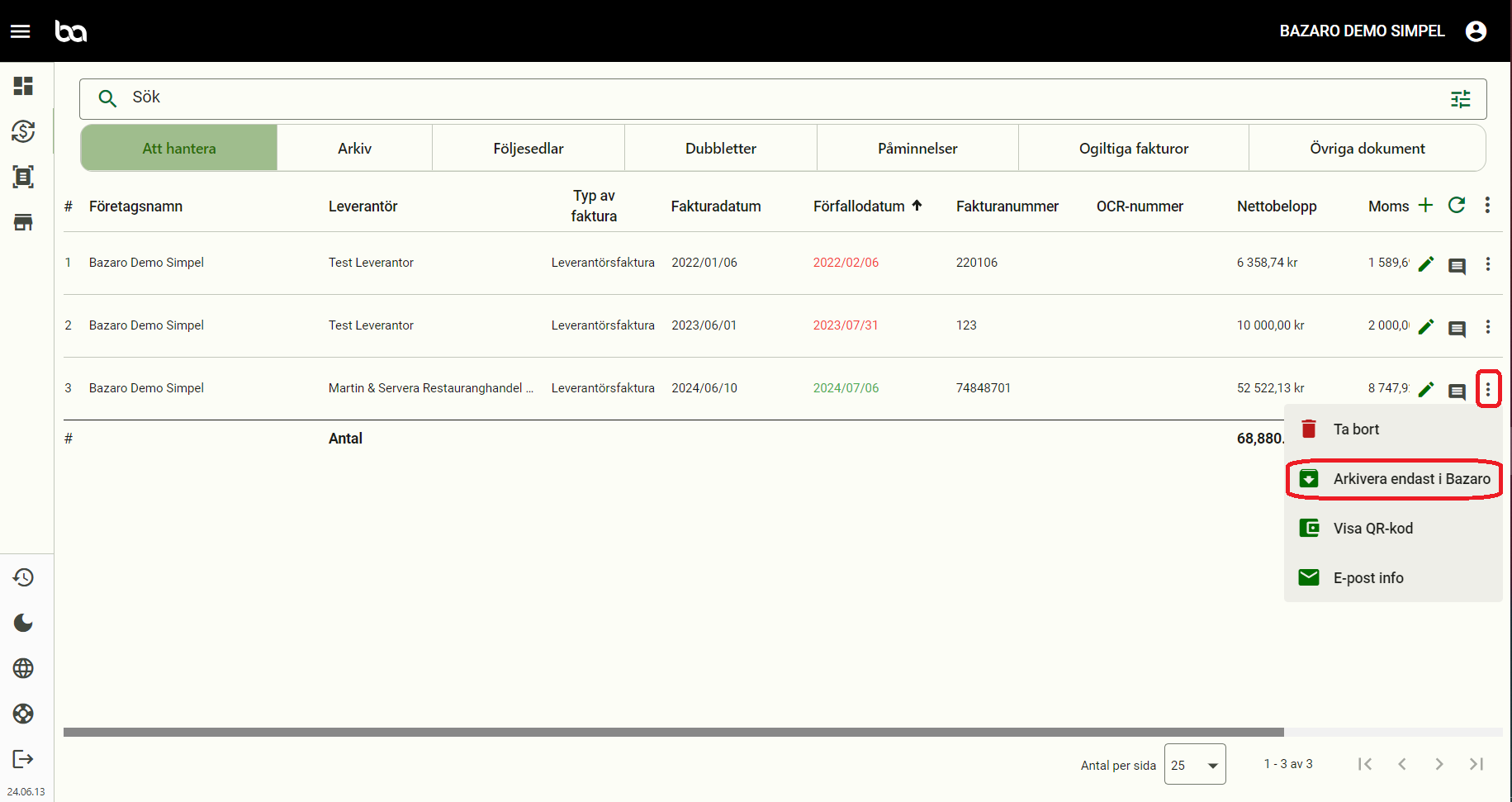 Steg 2. Klicka på de tre prickarna på den fakturan som du vill arkivera i Bazaro. Klicka sedan på "Arkivera endast i Bazaro"