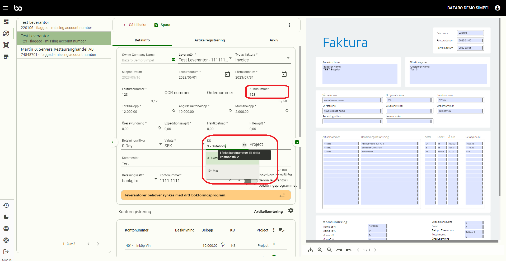 Steg 3, Välj kostnadsställe och klicka sedan på "". Detta kommer att koppla kundnumret till det valda kostnadsstället för alla framtida fakturor. Klicka därefter på "spara".