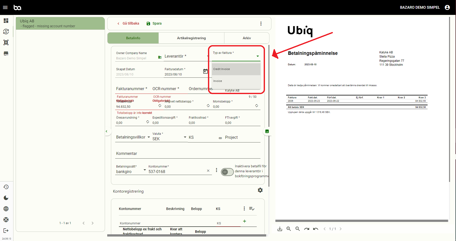 Steg 3. För att hantera fakturan klickar du på "Typ av faktura" och väljer "Credit invoice" eller "invoice" och sedan klickar du på "spara".