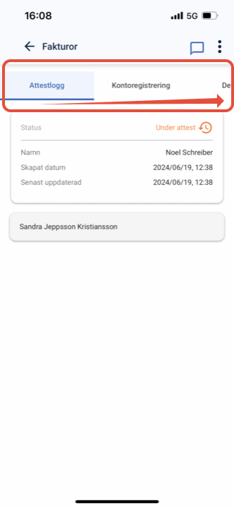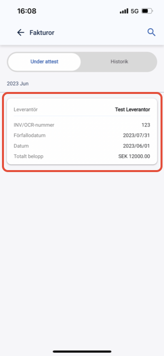 Steg 4, Dina fakturor som inväntar attest kommer synas i listan, klicka på fakturan du vill attestera