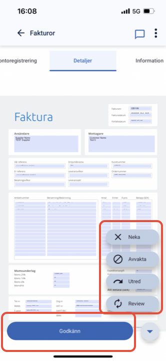 Steg 6, På fliken "Detaljer" kan fakturan antingen godkännas eller väljas något av de andra alternativen