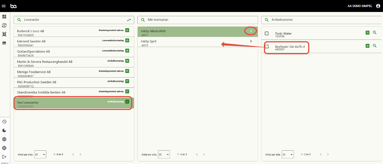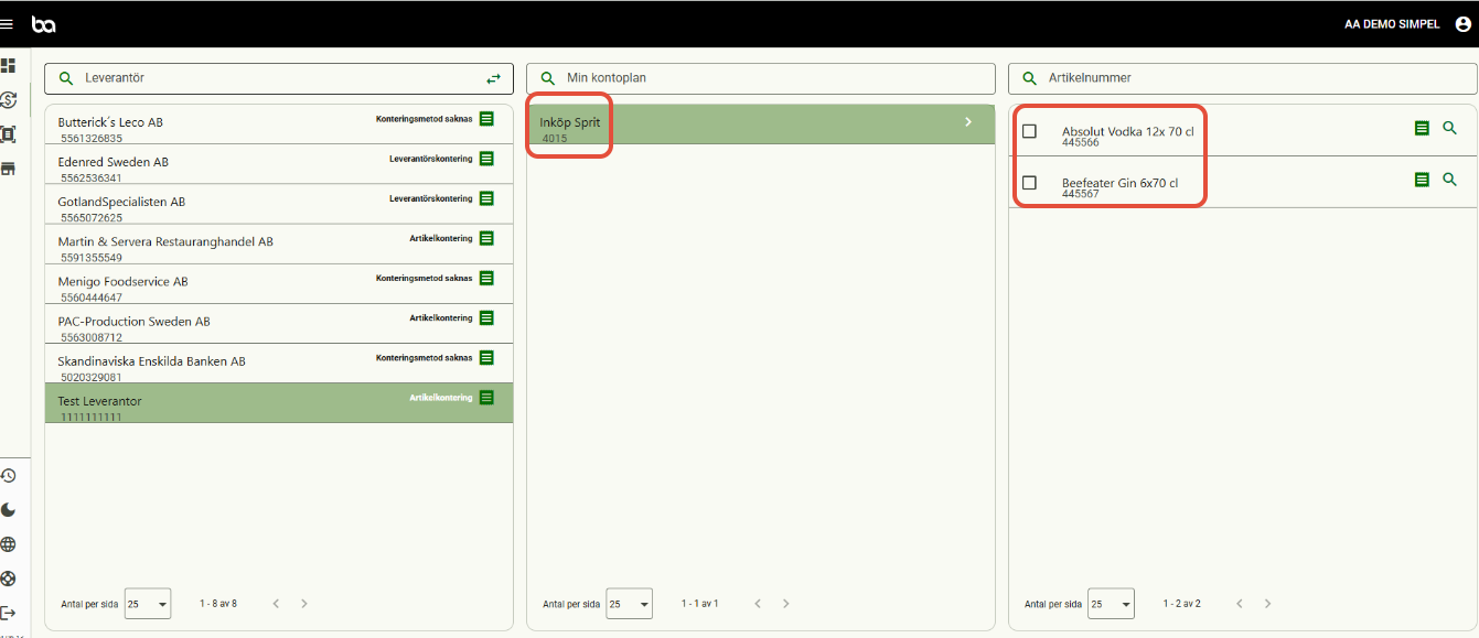 Klicka på leverantören du vill ändra kontering för och sedan ett konto. Artiklarna kommer då att visas och du kan dra dem till det korrekta kontot