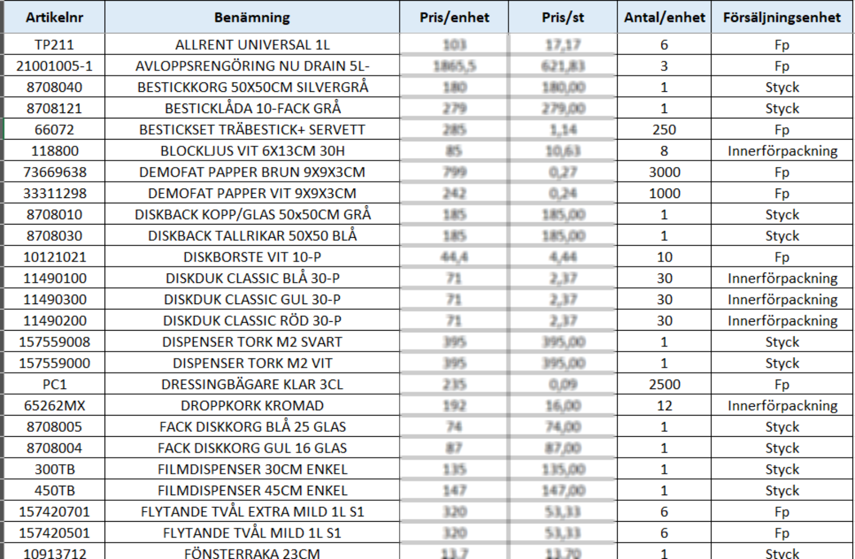 Detta är ett exempel på en pris-/ anbudslista från Tingstad. Ni behöver säkerställa att följande information finns med: