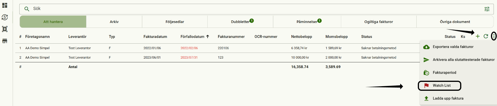 Behöver du se alla fakturor med en viss information. Då kan du använda Watchlist