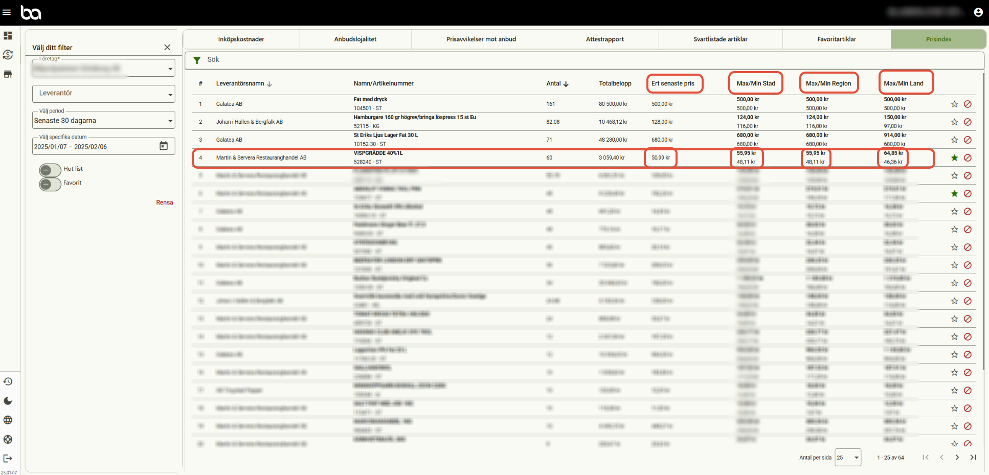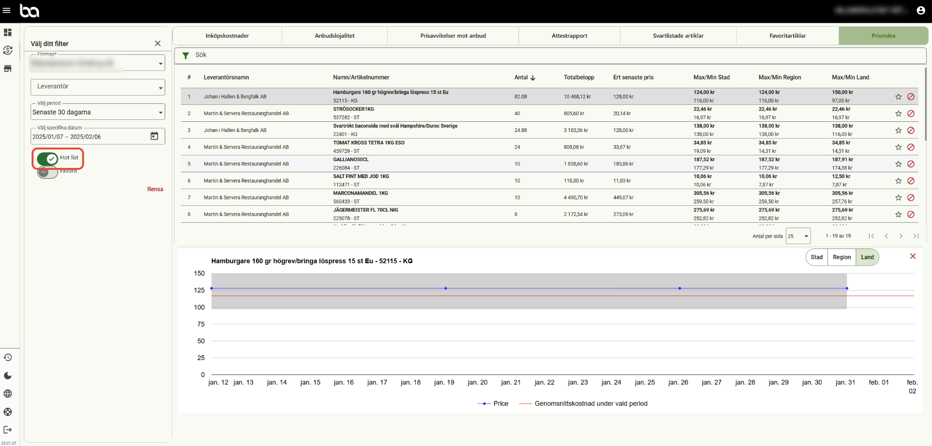 Steg 4, Knappen "Hot list" visar enbart de artiklar där du som kund betalar ett högre pris än genomsnittspriset.