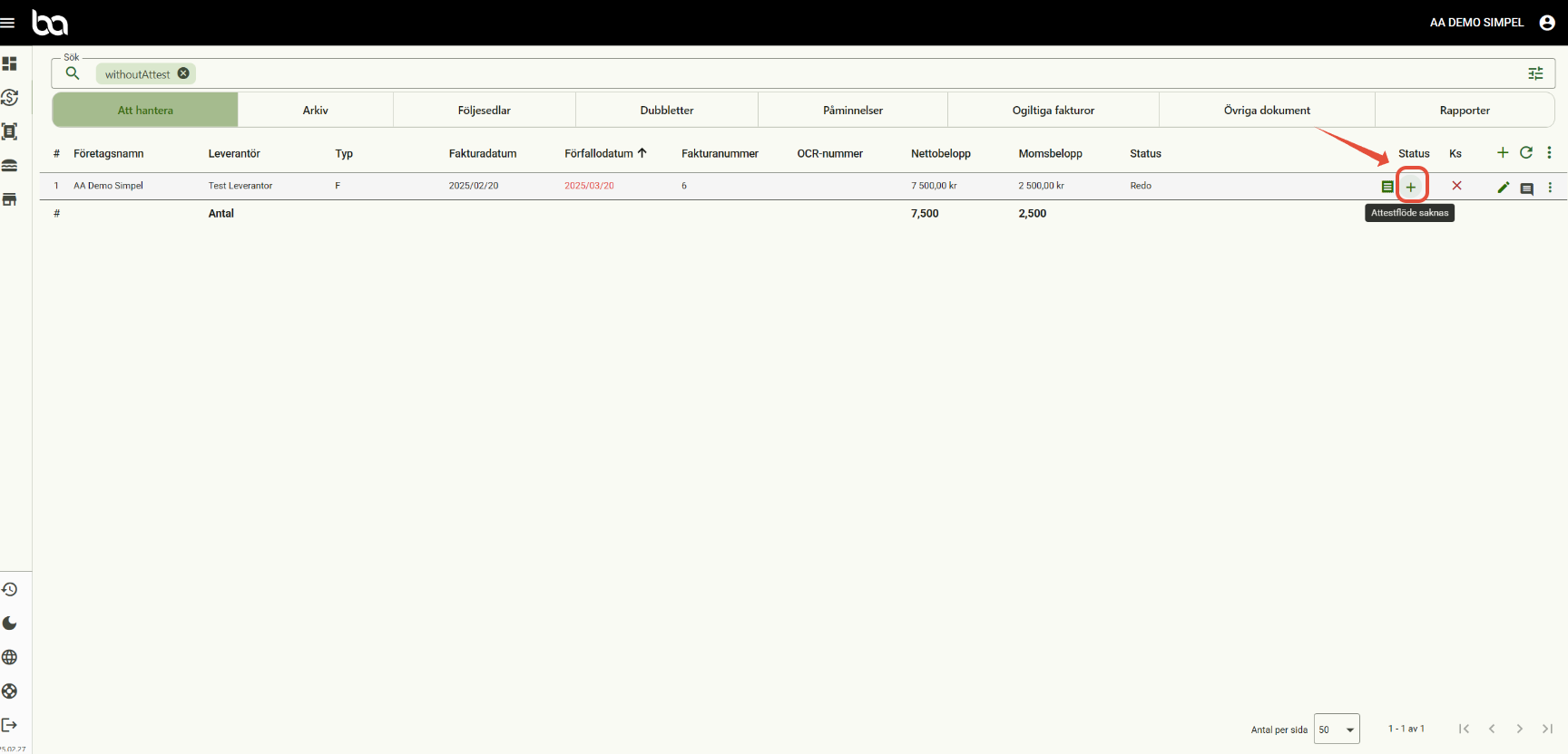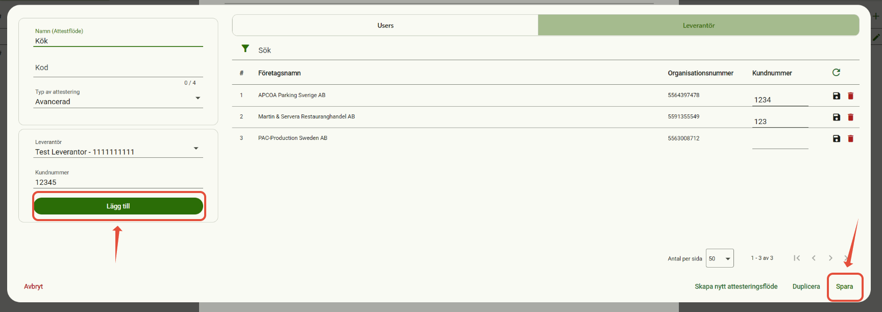 Klicka på "Lägg till". Detta kommer lägga till leverantören med det kundnumret i det valda attestflödet